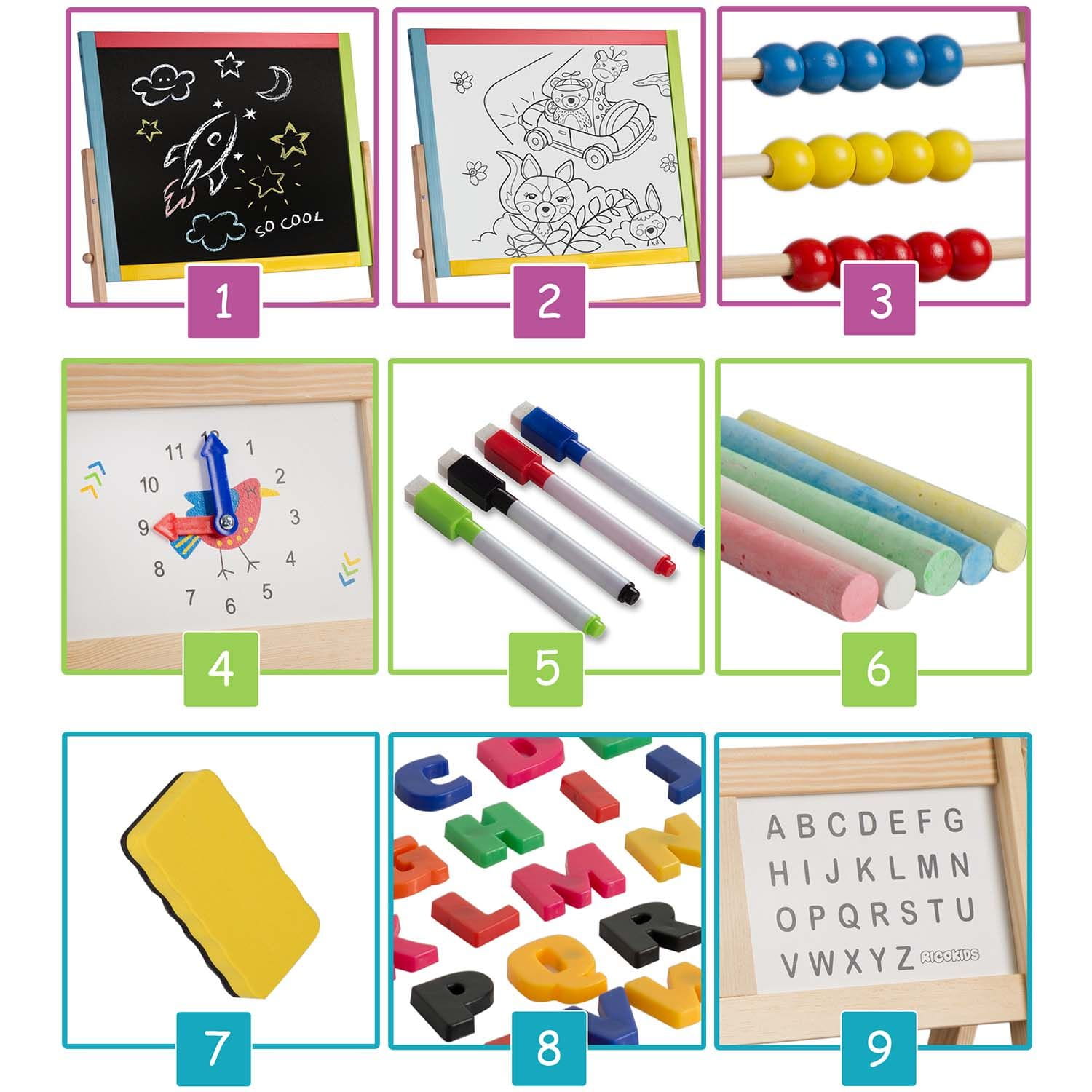 Tablica magnetyczna, kredowa, obrotowa, zegarek, liczydło, 104 cm. Spraw swojemu dziecku wyjątkową radość. Stabilna tablica do rysowania dla dzieci marki Ricokids, to spełnienie dziecięcych marzeń. Zestaw zawiera wszystkie najpotrzebniejsze rzeczy do nauki i zabawy.
