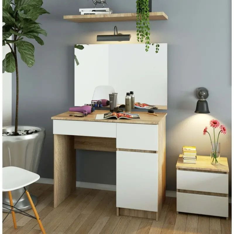 Toaletka kosmetyczna, duże lustro, prawa, 90x50x142 cm, biel, dąb sonoma, mat. Toaletka kosmetyczna z dużym lustrem to idealny mebel dla każdej kobiety. Idealnie sprawdzi się podczas robienia makijażu. Toaletka ma mnóstwo miejsca na przechowywanie kosmetyków oraz innych przedmiotów do codziennej pielęgnacji takich jak szczotki, pędzle, szminki, gumki do włosów. Duże lustro zapewni idealne warunki do tworzenia makijażu lub wymyślnej fryzury. Toaletka będzie świetnym uzupełnieniem nowoczesnej i eleganckiej sypialni.