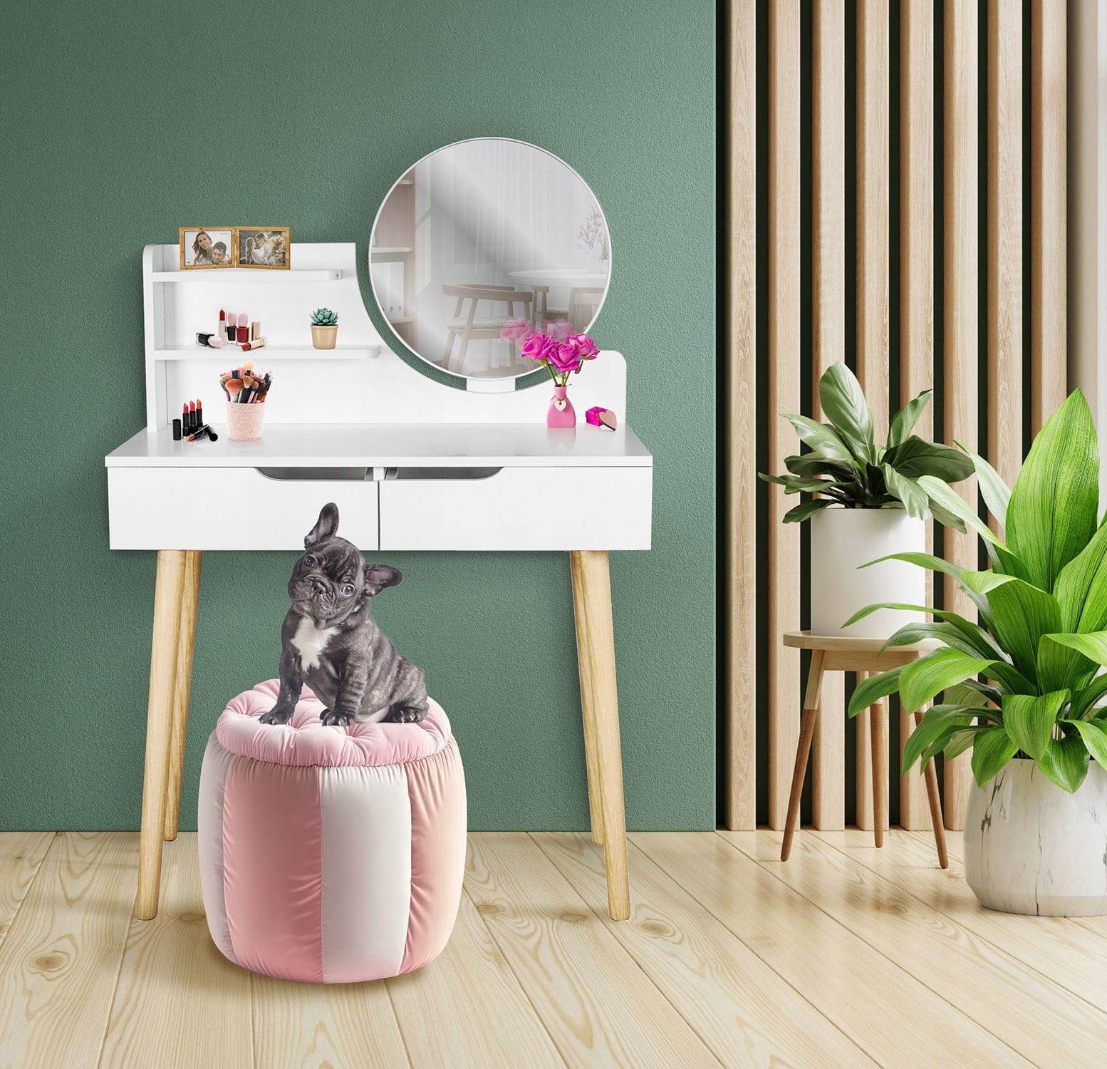 Mebel doskonale pasuje do sypialni jako praktyczne miejsce do wykonania makijażu, fryzury, codziennych pielęgnacyjnych czynności kosmetycznych, a także do napisania listu czy też przechowywania wielu rozmaitych drobiazgów.