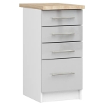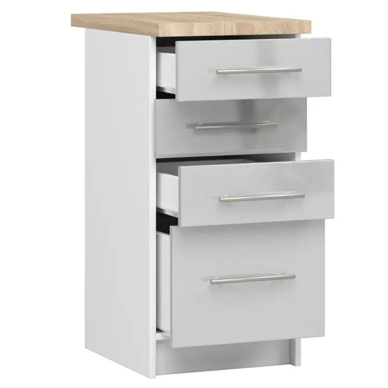 Wąska szafka z blatem, KLARA, 40x60x85 cm, biały, metalik, połysk. Szafka kuchenna przeznaczona do zabudowy modułowej. Prezentowany model składa się z czterech pojemnych szuflad, które pozwolą na przechowywanie wszelkich niezbędnych w kuchni artykułów począwszy od sztućców, przez naczynia, środki czystości, aż po artykuły spożywcze. Na uwagę zasługuje również wysoka odporność na ścieranie oraz trwałe wykonanie z dobrych gatunkowo materiałów.
