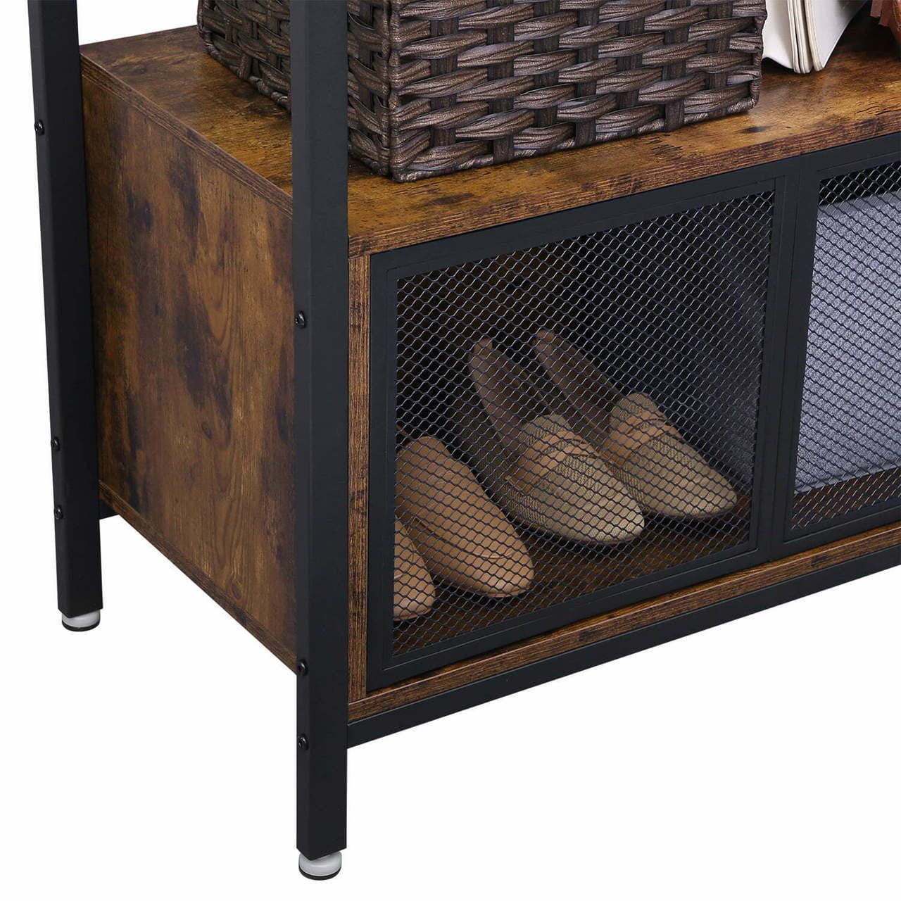 Wytrzymała konstrukcja pozwala utrzymać nawet duży ciężar. Czarna metalowa rama i rustykalne elementy w fakturze drewna na górze nadają mu dodatkowego uroku w stylu vintage. Regulowane nóżki dostosują mebel do nierówności podłogi.