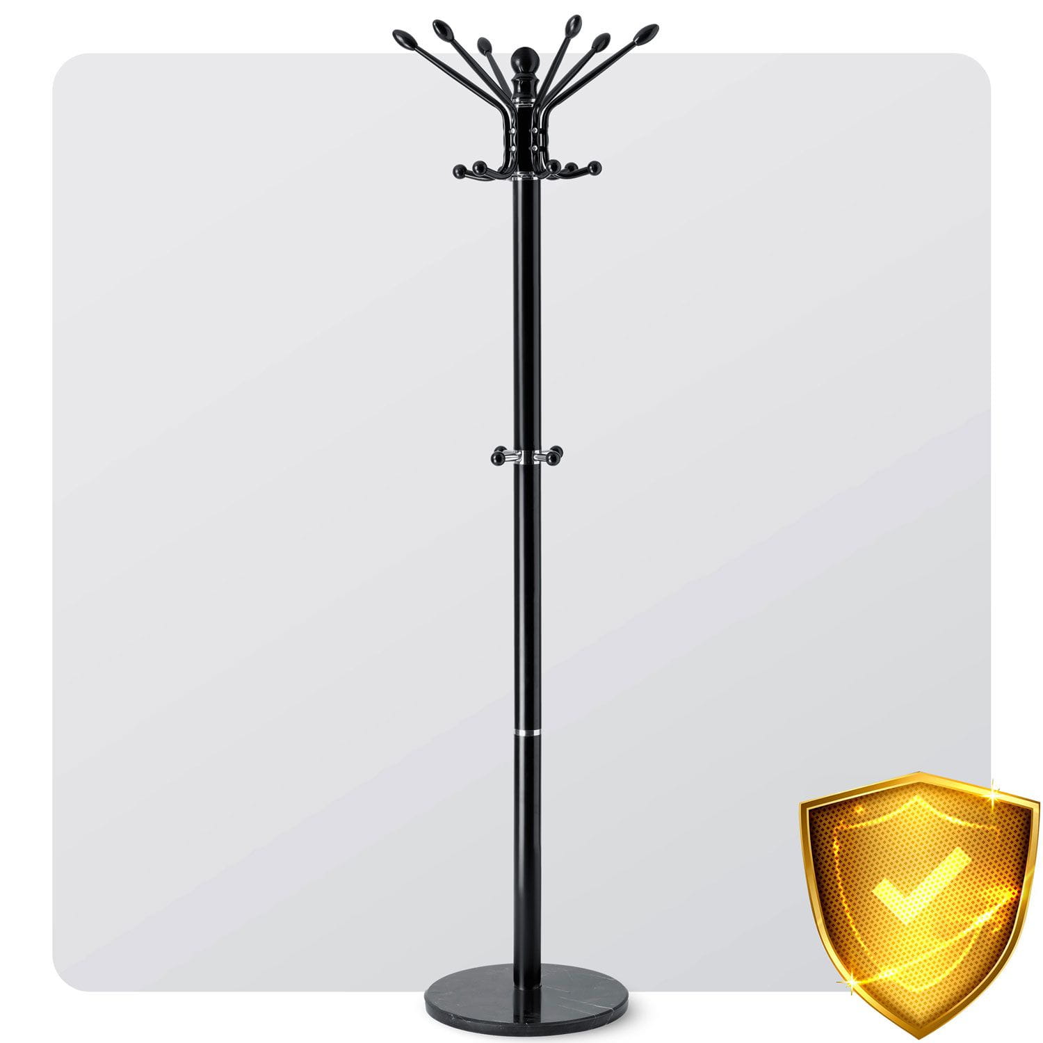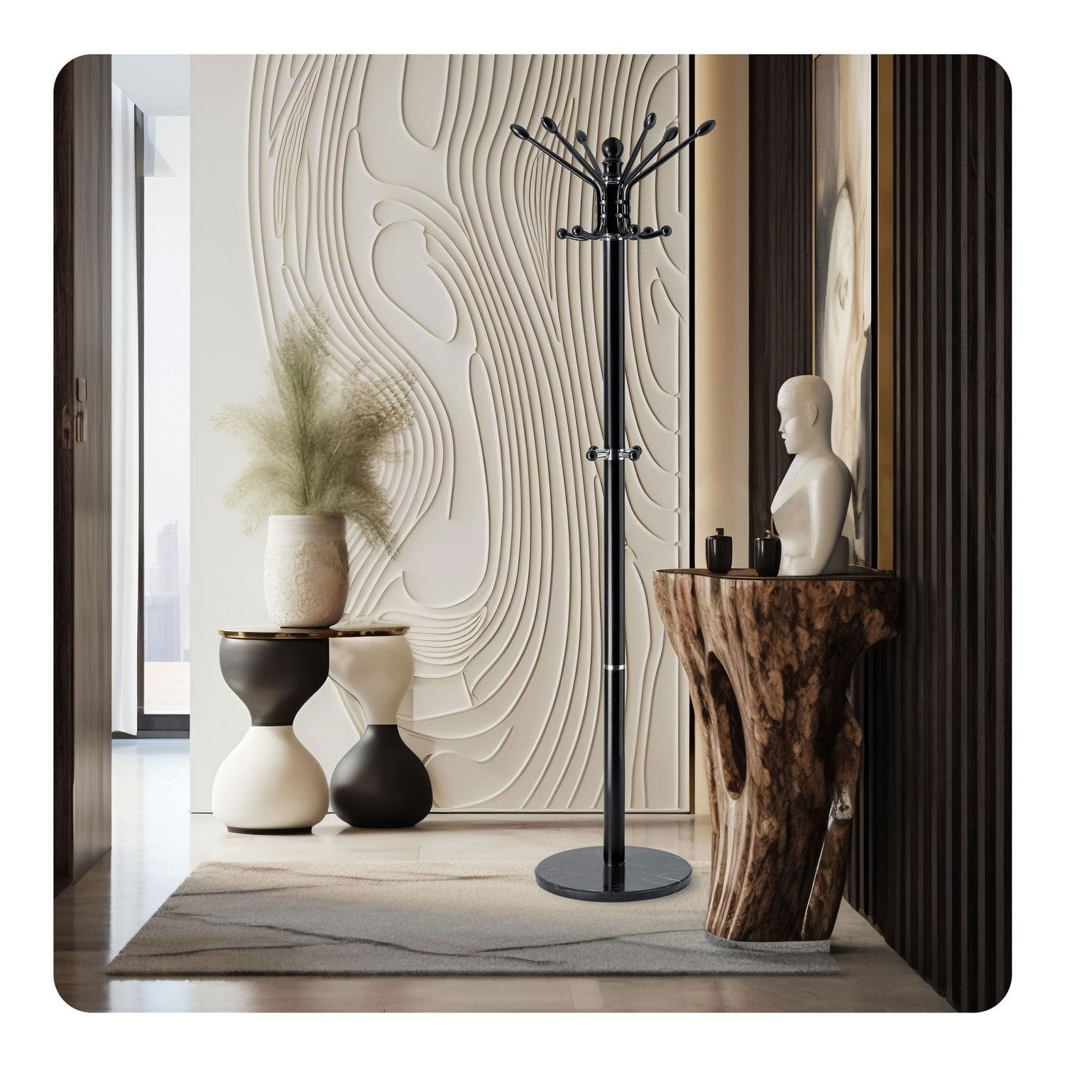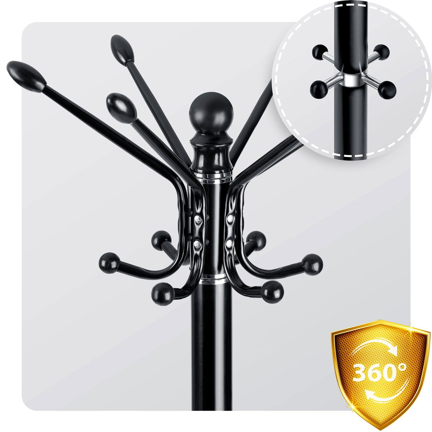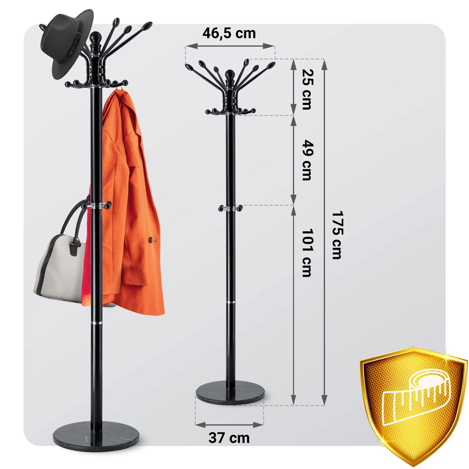 Wieszak na ubrania, podłogowy, Massido, 47x47x175 cm, czarny. Massido to wieszak z licznymi haczykami, dzięki którym okrycia głowy, płaszcze, kurtki, szaliki i inne elementy garderoby nie będą już zapełniać krzeseł czy foteli w salonie. Dodatkowo posiada również miejsce na torby, które idealnie sprawdzi się również dla rodziny posiadającej dzieci, dzięki swojej ergonomicznej wysokości