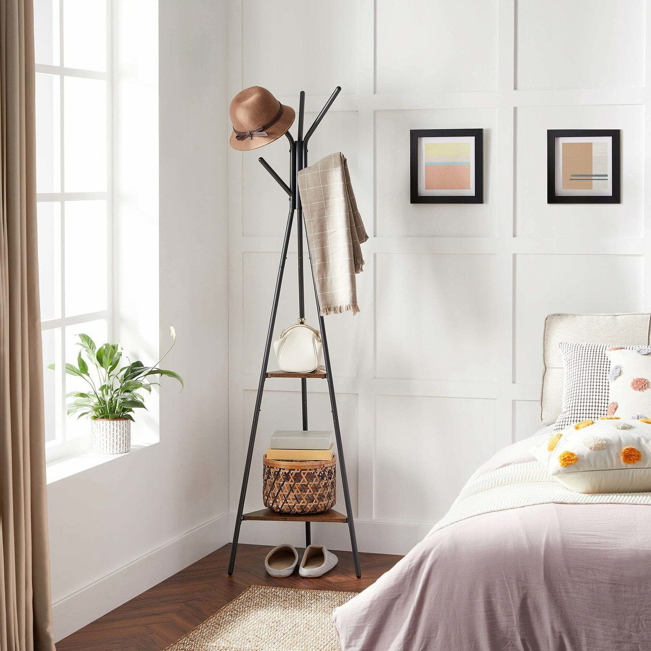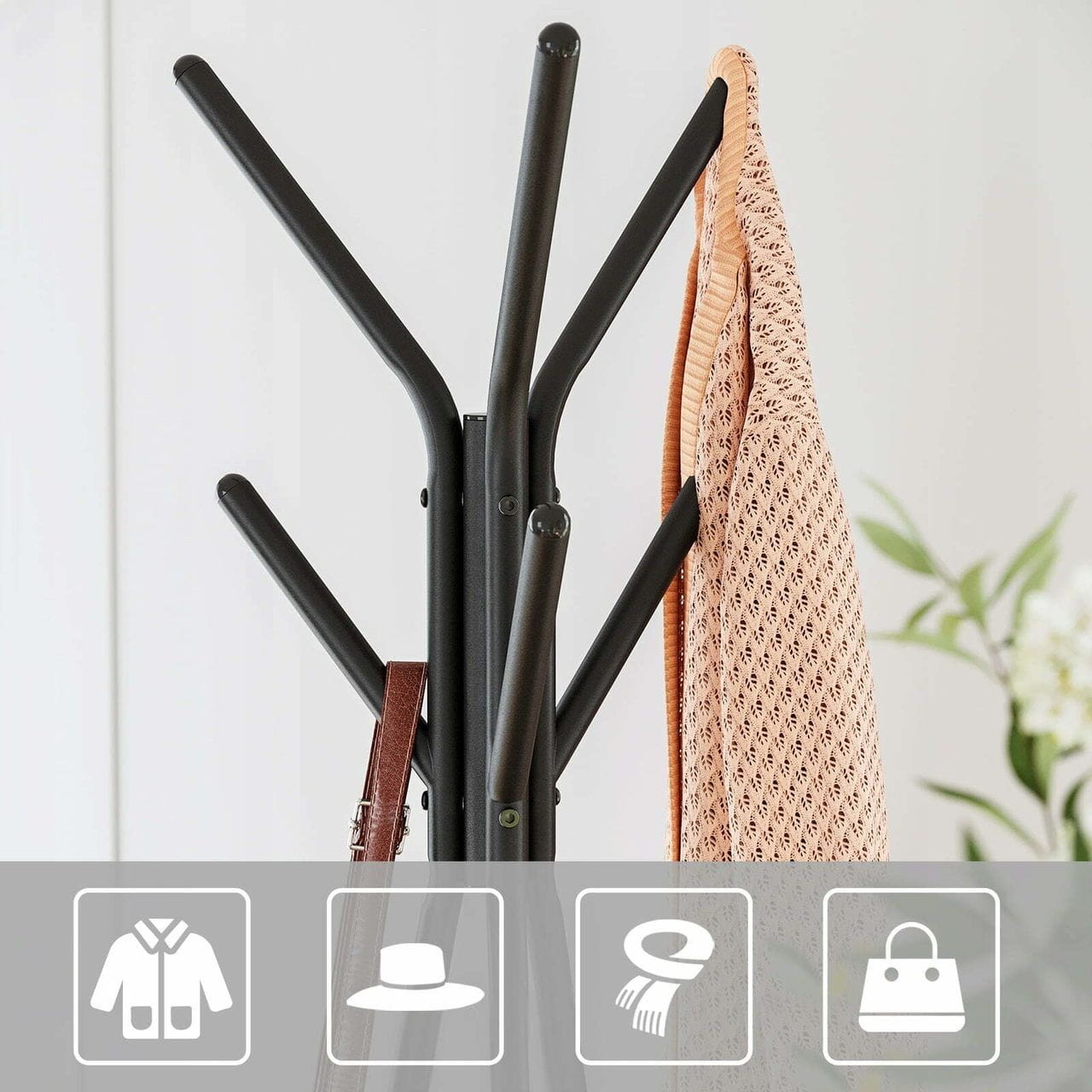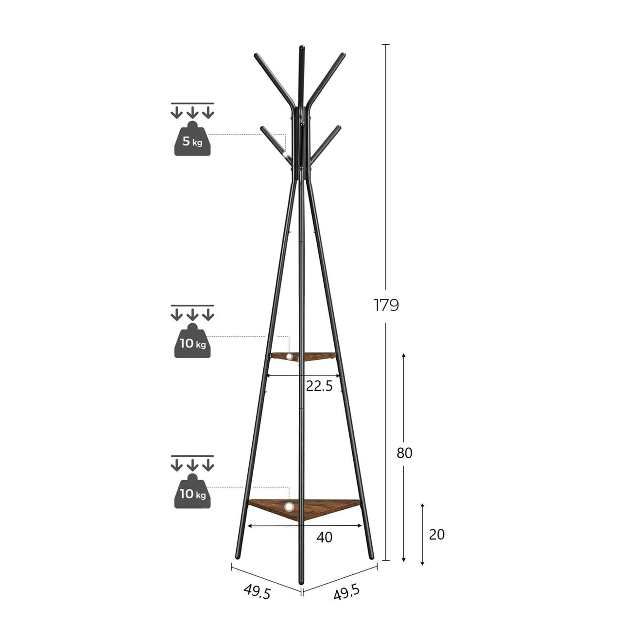 Wieszak na ubrania stojący, 49x49x179 cm, ciemny brąz, czarny, mat. Niecodzienny wieszak w kształcie drzewa pięknie wygląda, przy czym jest naprawdę pojemny. Pięć haków, na których możesz zawiesić ubrania, plecaki czy torebki o wadze do 5 kg. Dwie trójkątne półki oferują dodatkowe miejsce na książki, ozdoby czy kwiaty. Wieszak idealnie wpasuje się do każdego pokoju, nadając mu unikalnego klimatu.