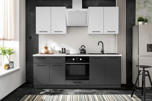 Zestaw mebli kuchennych, 220 cm, biały, szary grafit, mat. Funkcjonalny zestaw mebli kuchennych, który pozwala zagospodarować nawet najmniejszą przestrzeń. Dwie praktyczne szafki wiszące idealnie współgrają z trzema pojemnymi szafkami stojącymi, w których możesz umieścić wszystkie potrzebne elementy wyposażenia kuchni.
